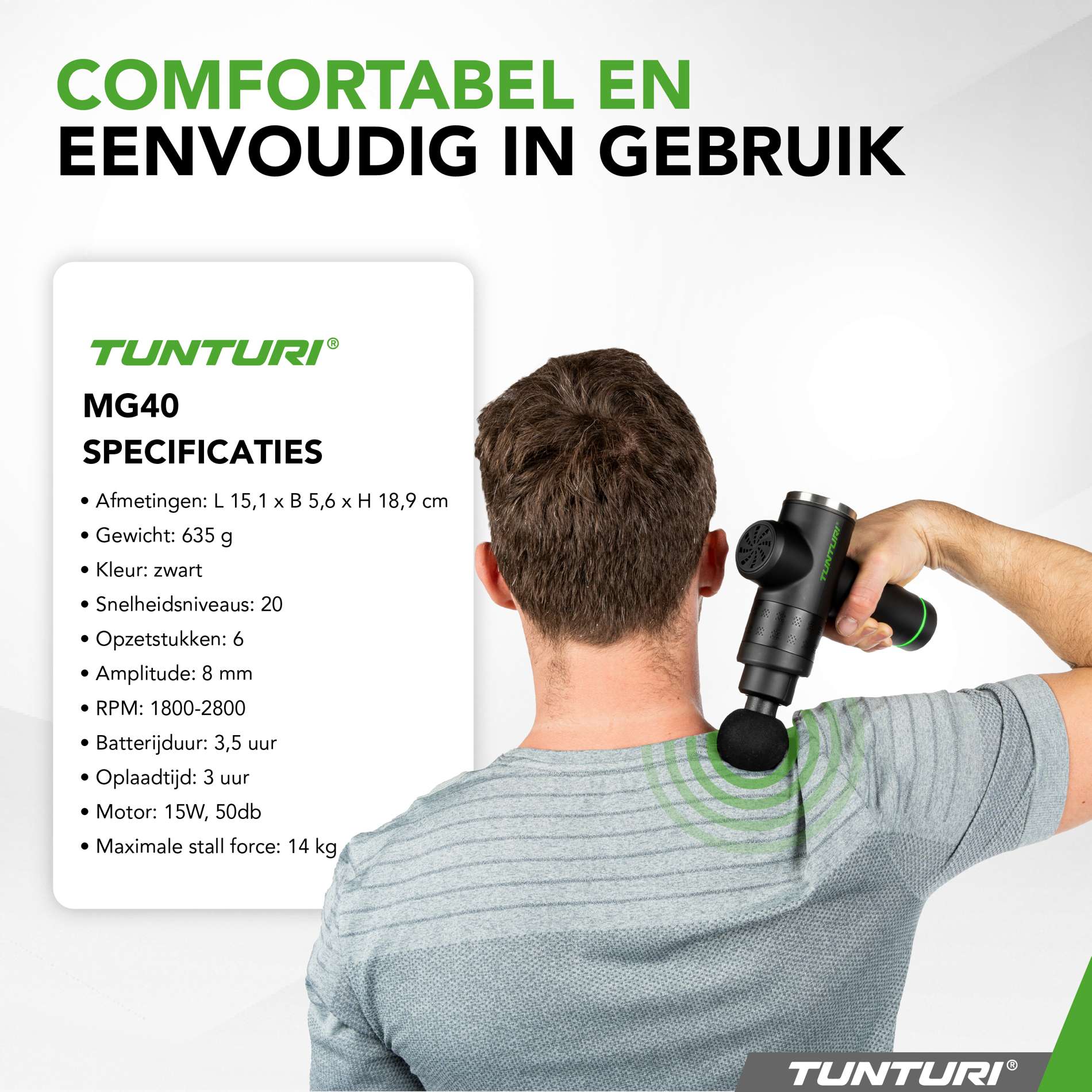 Ervaar zelf de voordelen van de Tunturi MG40 Massage Gun. Bestel vandaag en geniet van een diepe, ontspannende massage waar je ook bent!